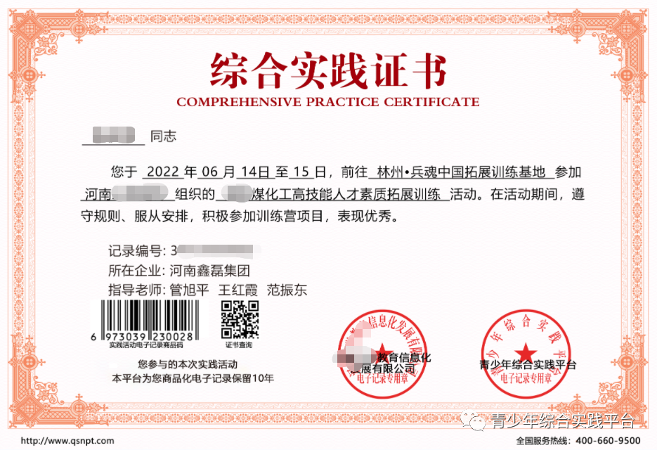 综合实践证书,可以把青少年活动记录储存到青少年综合实践平台 www.qsnpt.com 的网站上,至少保存10年以上,为今后孩子们各阶段升学、考试、综合素质评价得分、应聘、留学等众多需求时提供依据,欢迎各位合作伙伴积极联系我们。